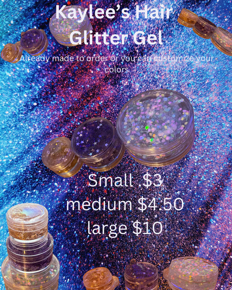 Kaylee’s Hair Glitter Gel is created by Kaylee, a bright and creative 9-year-old who absolutely loves everything sparkly—and wants to share that joy with the world. Her glitter gel adds the perfect touch of shimmer for holidays, birthdays, special events, or simply “just because.” No matter the occasion, a little sparkle from Kaylee’s Hair Glitter Gel is always a good idea.
